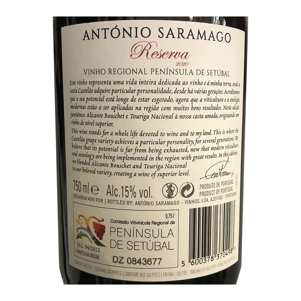 Le Antonio Saramago - Vin Rouge, avec 750ml est un Vin Rouge produit en/au Portugal - Península de Setúbal par António Saramago.